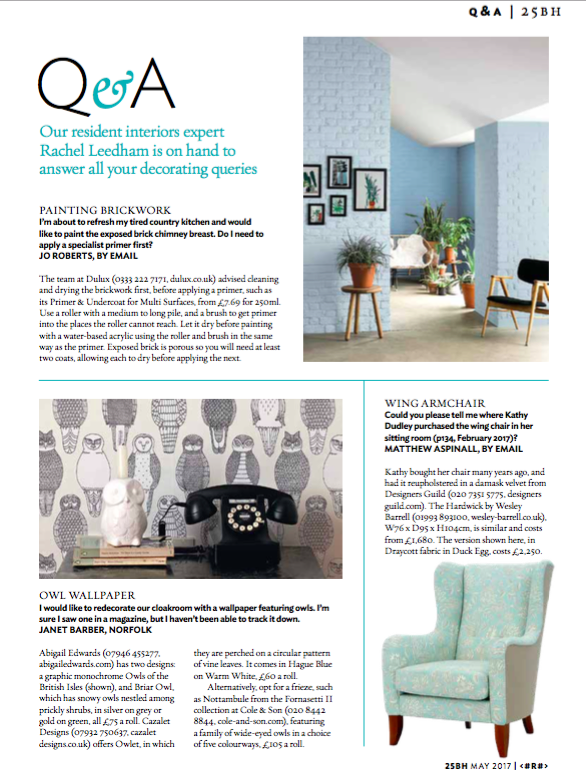 Rachel Leedham, interiors expert at 25 Beautiful Homes magazine, has included Owls of the British Isles wallpaper in her Decorating Advice page of the magazine. To read more of Rachel’s advice to readers have a look at the May 2017 issue of 25 Beautiful Homes.