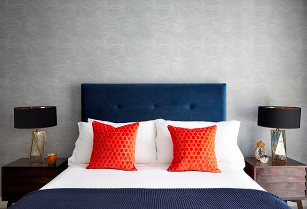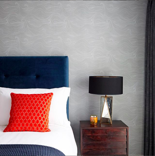 I love how they have used Seascape at Dusk wallpaper in this very civilised, masculine bedroom with flashes of orange lifting the scheme. Angela says- “The design was for a riverside apartment and obvious as it sounds, that connection to the water was really beautiful. I think we really love the simplicity of the drawing... there is an incredible clarity about them”.