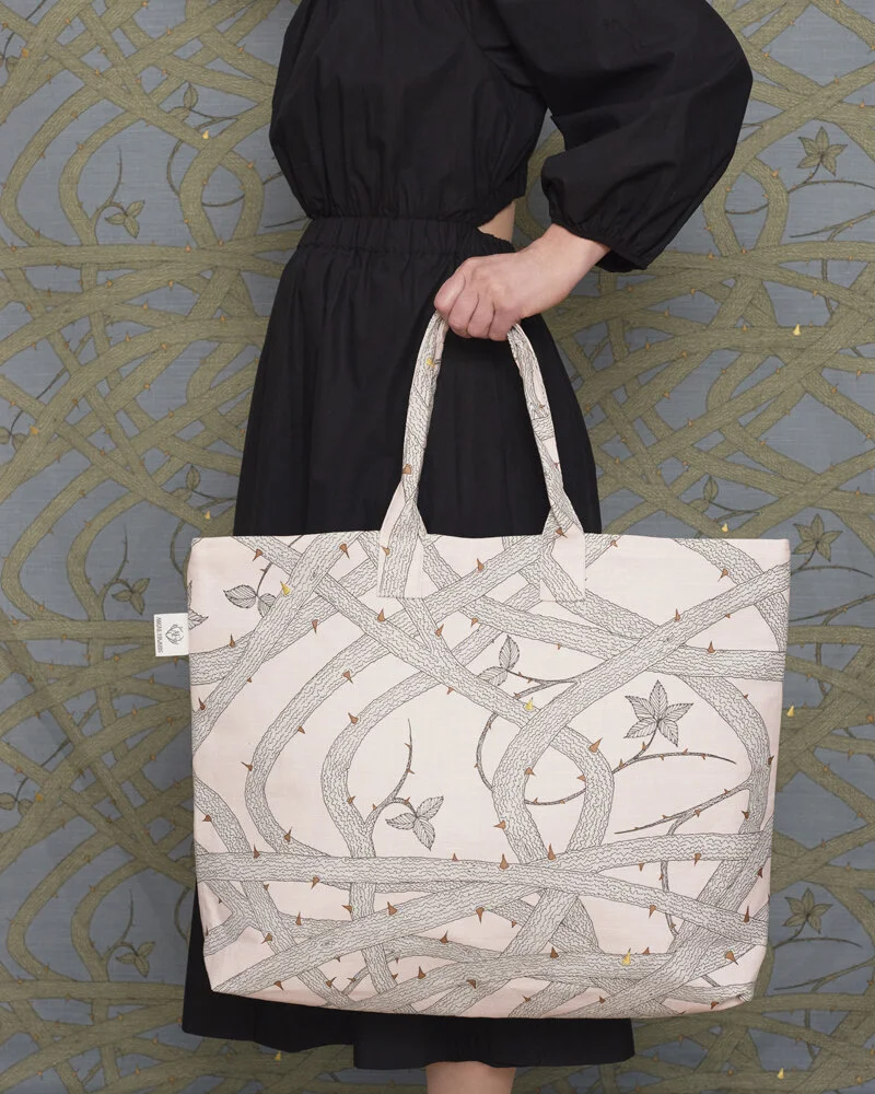 Nature inspired patterns warm up softly minimalist homes and work equally well in maximalist spaces. Patterns give energy to an interior, so whether you want to go big and brave with a fully wallpapered room, or create simple curtain panels, just one accent cushion on your sofa or even a super roomy bag. Brambleweb is available in many different forms.