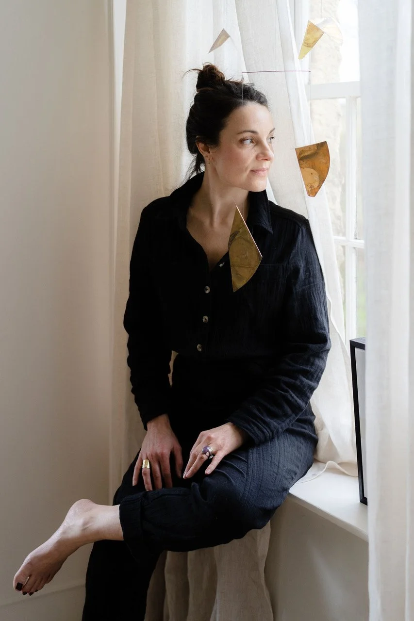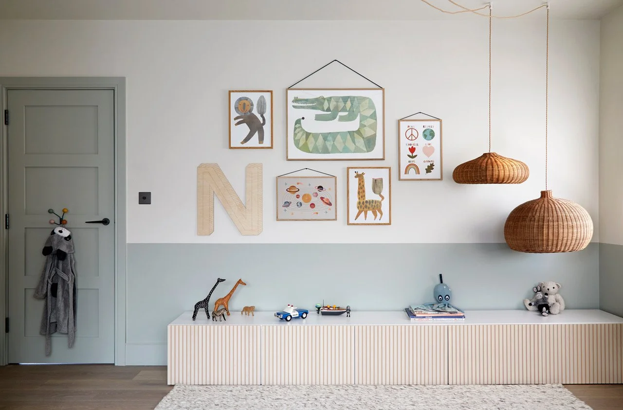 This childs bedroom is in a 1960’s house that lies close to beautiful woodland and the client shares Gemma’s love of nature and irregular, organic shapes. “The little person who this room belongs to loves trees so the theme for this room was determined: calm, natural and connected with the setting. I love the fleck of gold in Oak Tree wallpaper, a beautiful detail that the client also fell in love with.” Oak flooring and a beautiful rug continue the natural finishes. “I prefer to use desaturated colour palettes and natural materials, allowing art and objects space to emit their presence,” says Gemma.